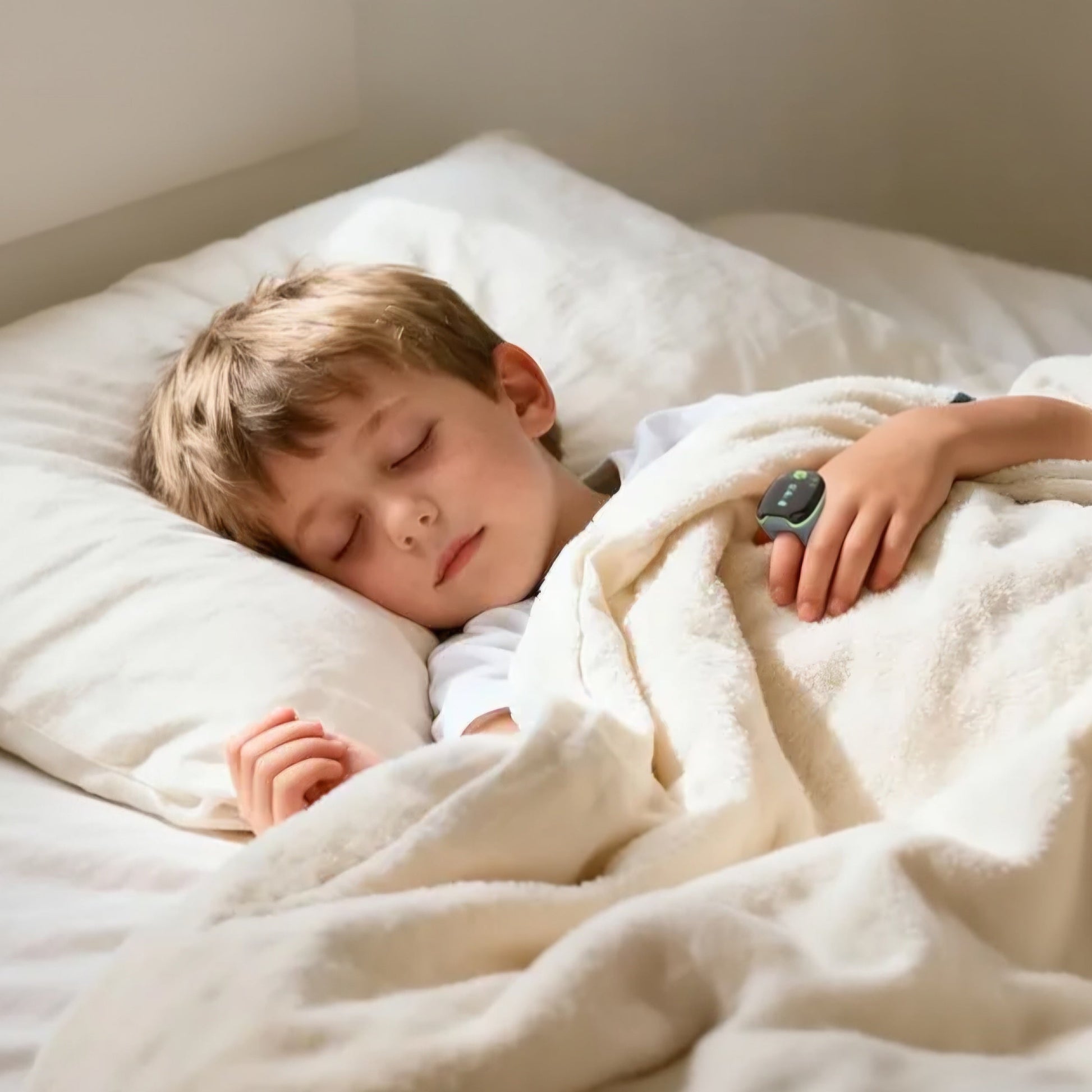 Med børne oximeteret får du målinger af puls og iltmætning direkte på på telefon og enhed hurtigt og uden besvær. Den lette ring sidder behageligt og bliver på også når barnet bevæger sig eller sover.