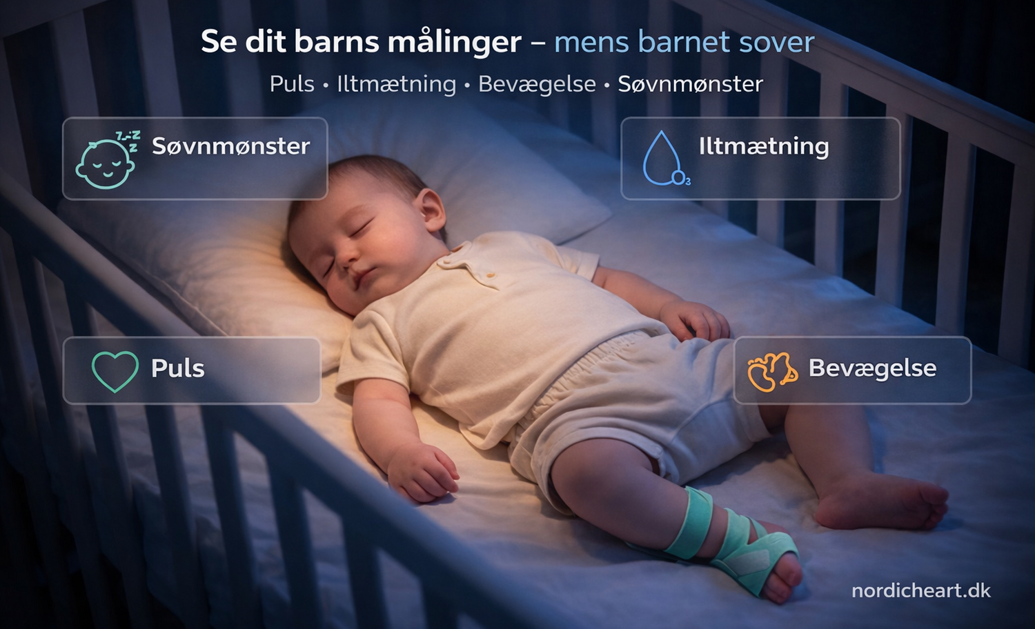 Følg dit barns puls og iltmætning i realtid, mens bevægelse under målingen også kan ses i appen.
